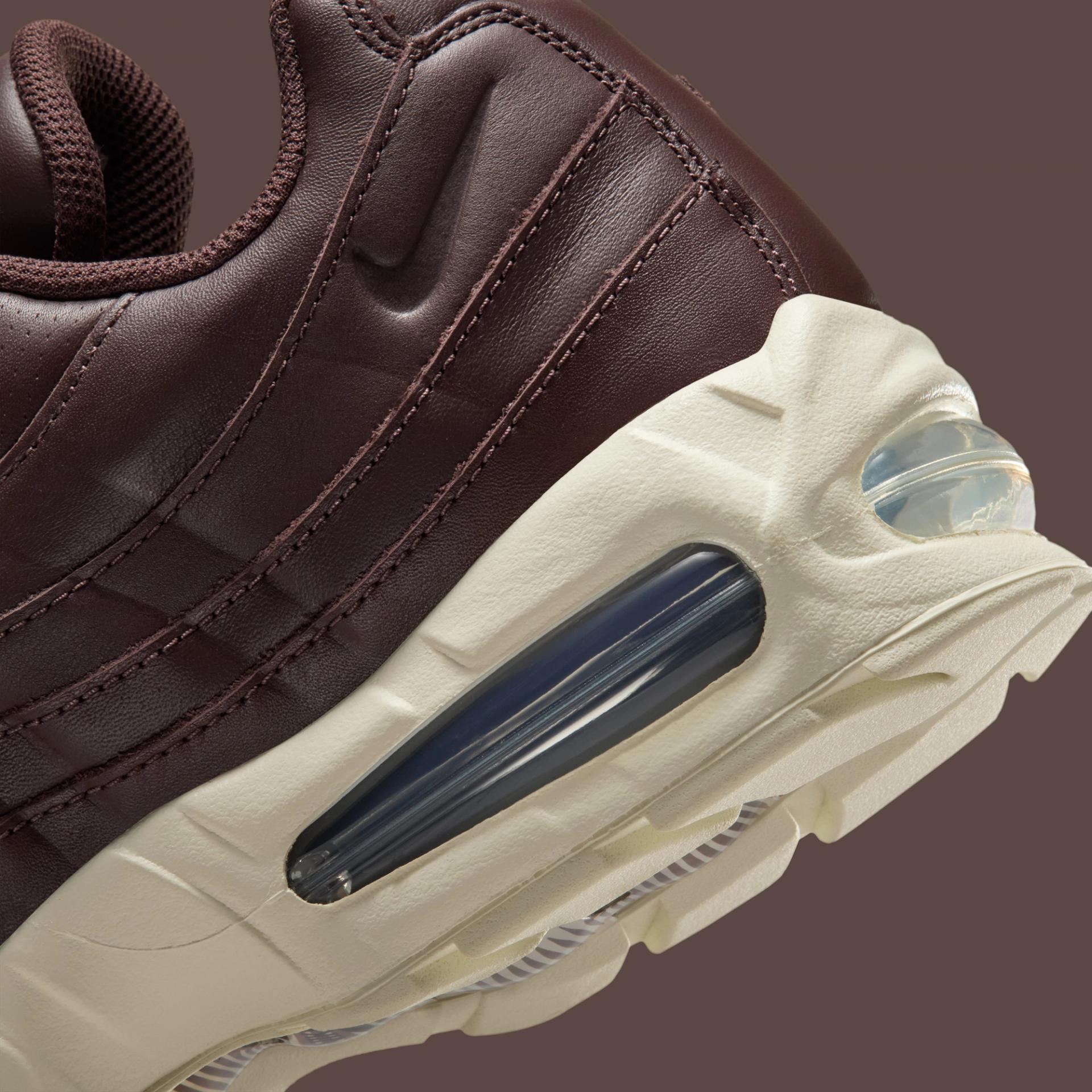 La decisión clave en estas Nike Air Max 95 está en el material. Donde antes había malla técnica, ante y capas pensadas para el rendimiento, ahora hay cuero de principio a fin. Un cuero marrón profundo —Baroque Brown— que cubre todo el upper y transforma por completo la lectura de la silueta.