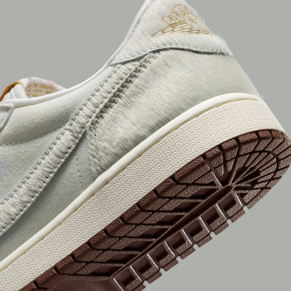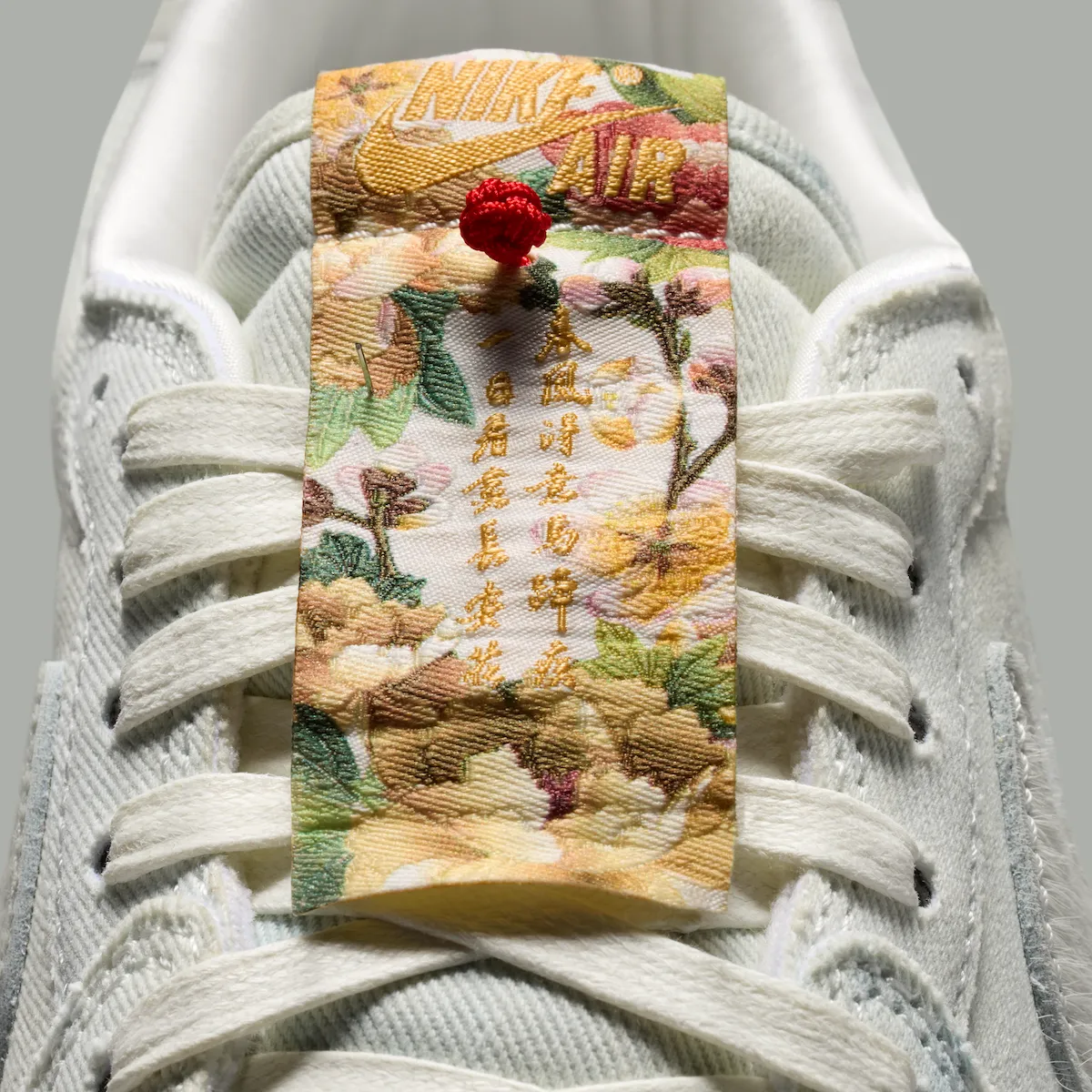 A diferencia de lo que vemos habitualmente en las AJ1, estas sneakers se han confeccionado en tela vaquera blanca con ligeros toques azulesque se aprecian sobre todo en la zona del empeine y el talón. De quedar así serían sin duda unas deportivas ideales, pero al tratarse de una edición especial presentan un decorado deslumbrante.