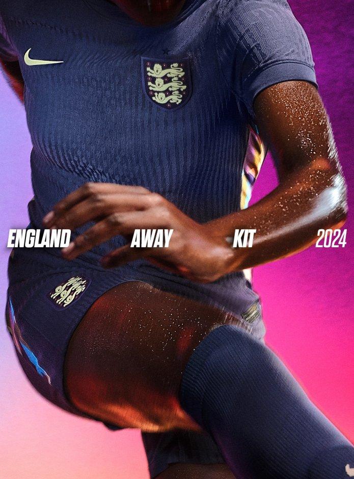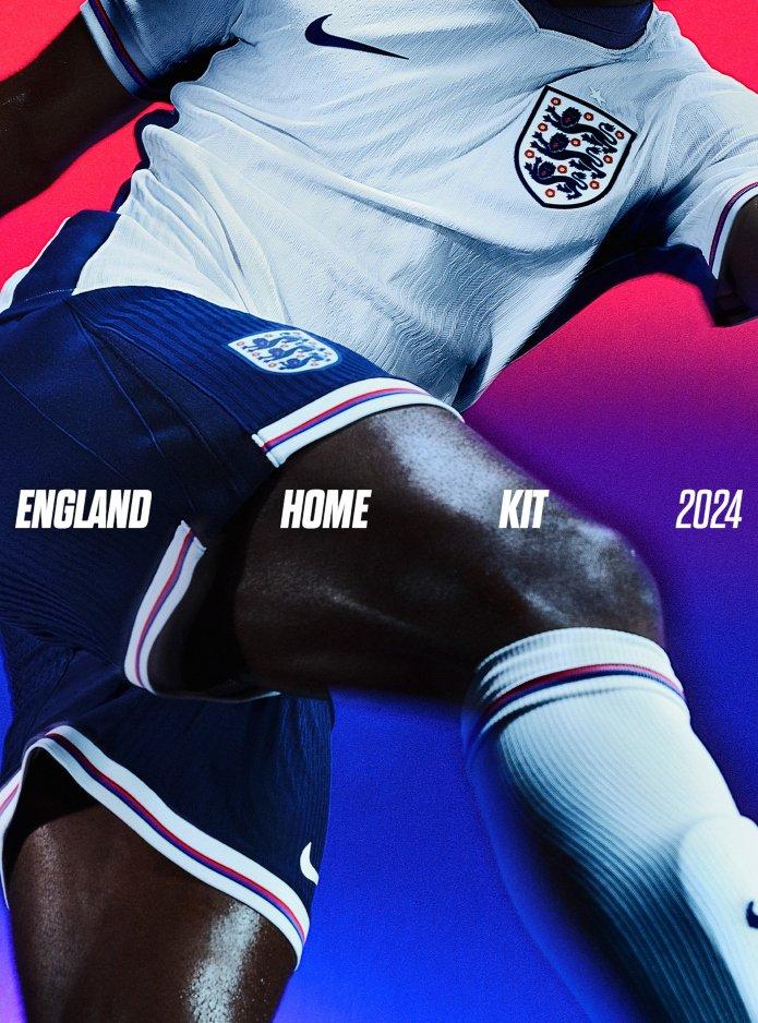 Nike ha presentado la equipación de Inglaterra para 2024 como un diseño que moderniza el estilo clásico del equipo. La camiseta de local es blanca con un cuello en azul marino y unos remates en las mangas que combinan morado, rojo y azul.