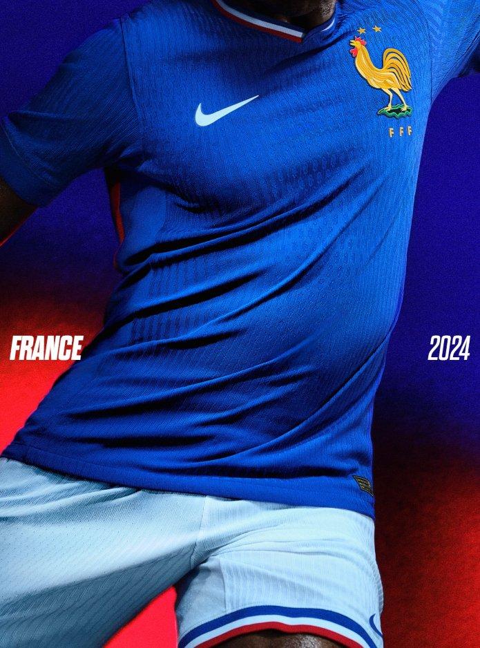 ¡Vuelta al pasado! La primera equipación de la selección francesa de fútbol está inspirada en las que vistieron los jugadores durante la década de los 80. Uno de los elementos más retro es precisamente el escudo del gallo con todos los colores y un tamaño más grande del habitual. La camiseta es azul con un remate tricolor en el cuello para representar la bandera.