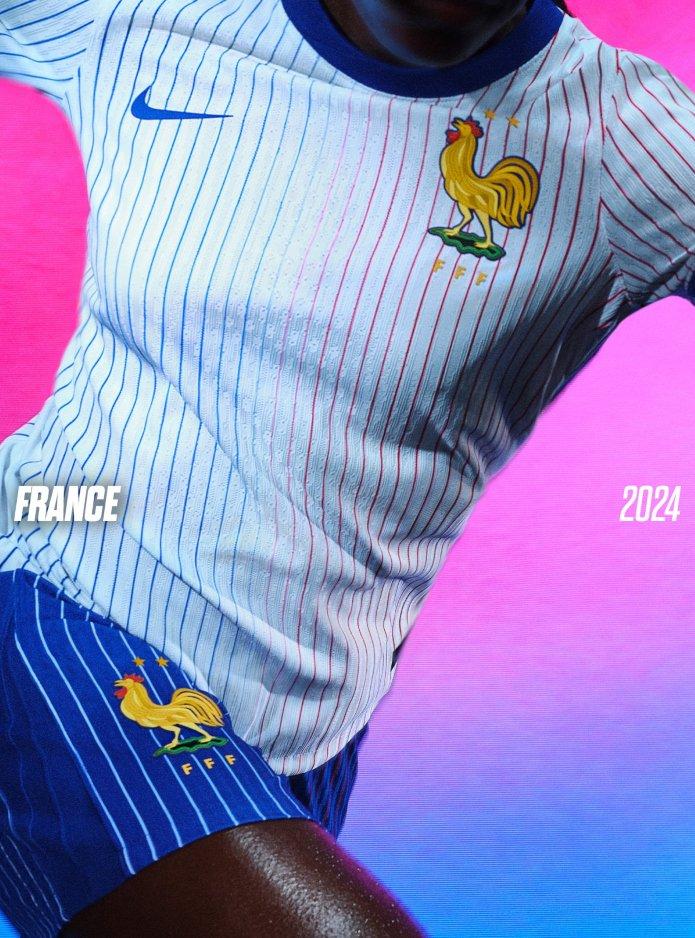 La camiseta de la segunda equipación de Francia mantiene la estética clásica, aunque esta vez es blanca con unas finas líneas verticales en rojo y azul que cubren toda la prenda.